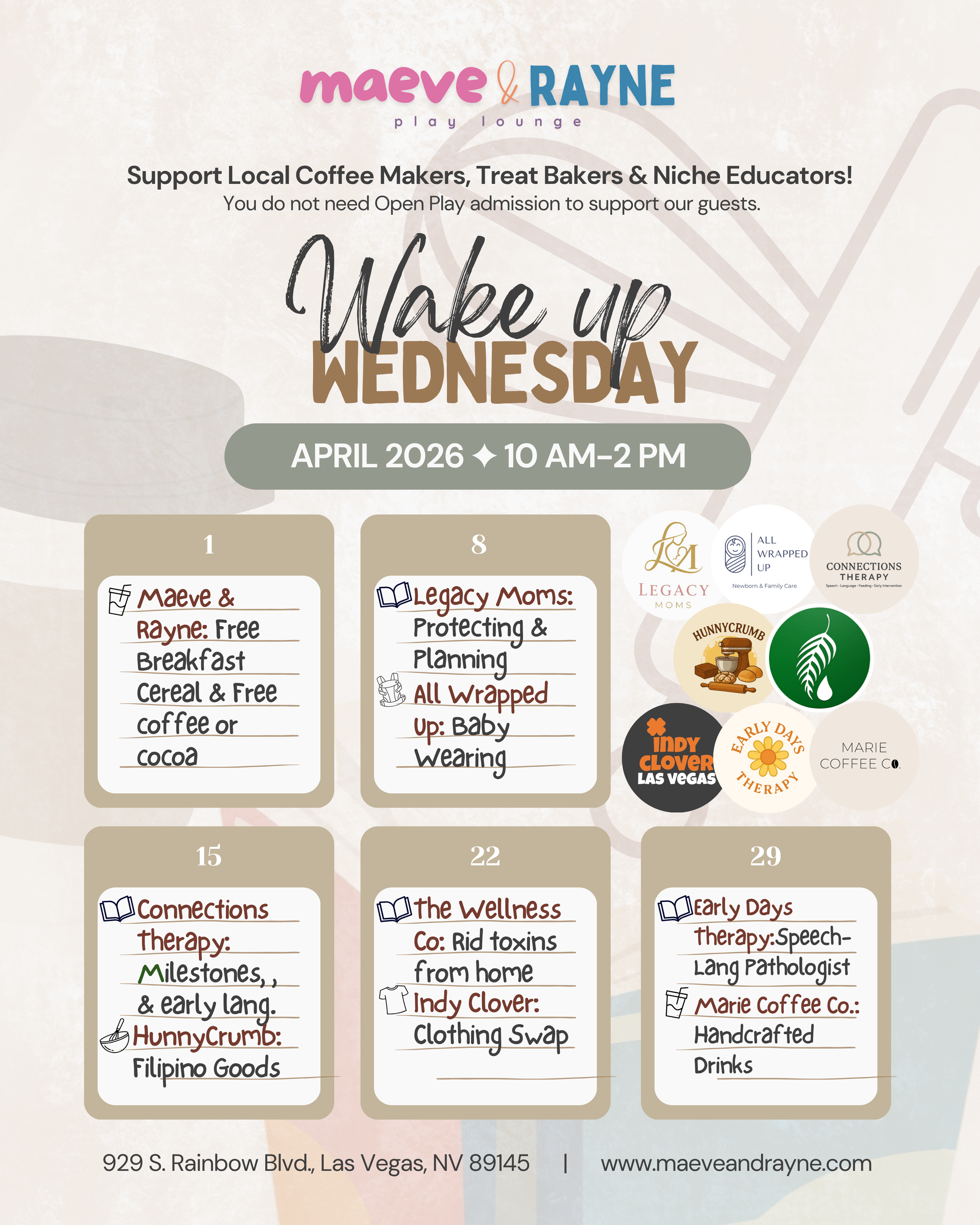 Wake Up Wednesday at Maeve & Rayne Play Lounge is a midweek playtime for little ones and caregivers. Enjoy open play in a clean, safe indoor playground while featuring local coffee makers and treat bakers at the lounge—perfect for kids to play, parents to sip, and everyone to start the day with fun.